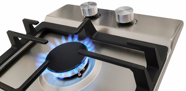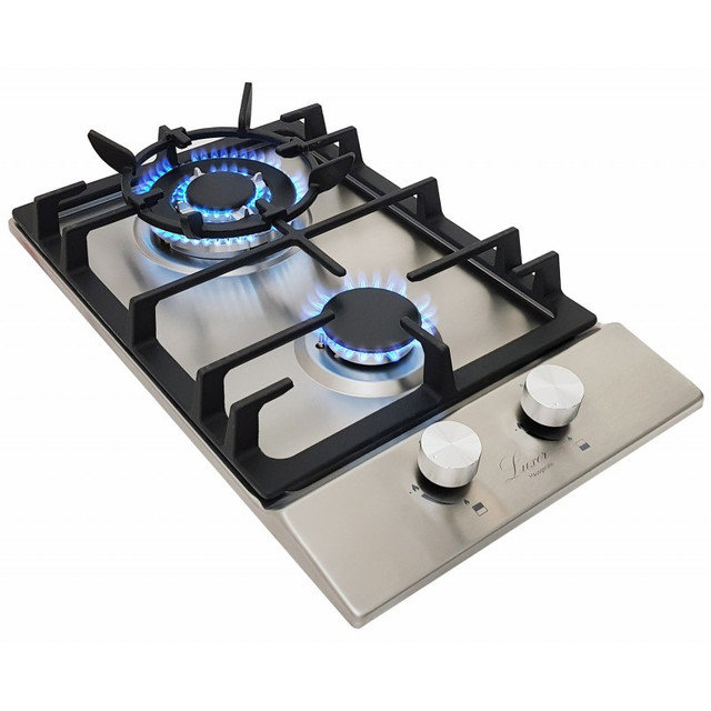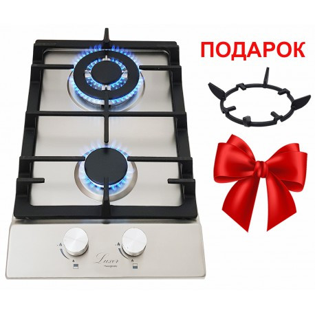 Варильна поверхня газова на дві конфорки з якісної нержавіючої сталі з максимальною функціональністю. Автоматичне підпалювання в ручці, Газ-контроль. Чавунна решітка. Turbo пальник WOK на три кільця полум'я з потужним нагріванням для великого діаметра посуду.