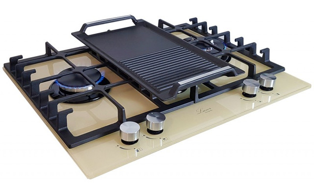 Функціональна вбудована газова поверхня кремовий колір, Газ — конторль, автоматичне підпалювання, чавунна суцільна решітка. Два великі пальники + середня та мала. Захист від проливання. Німеччина