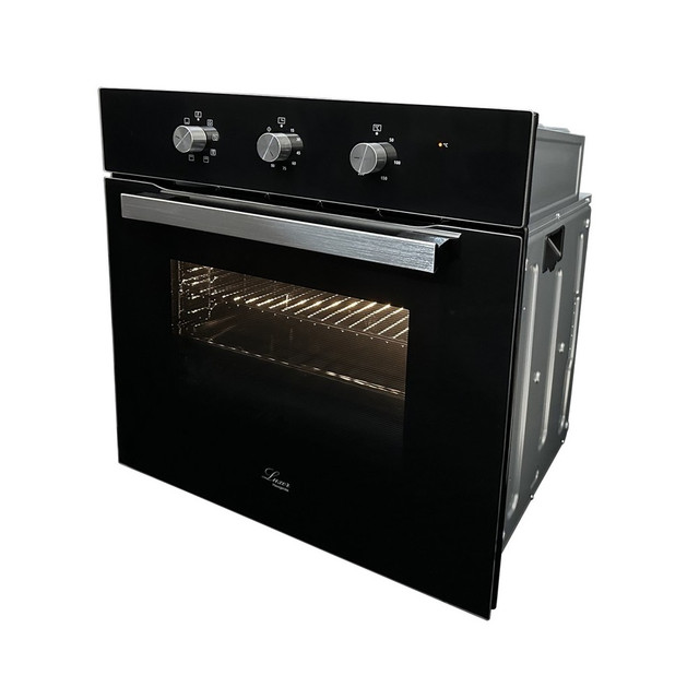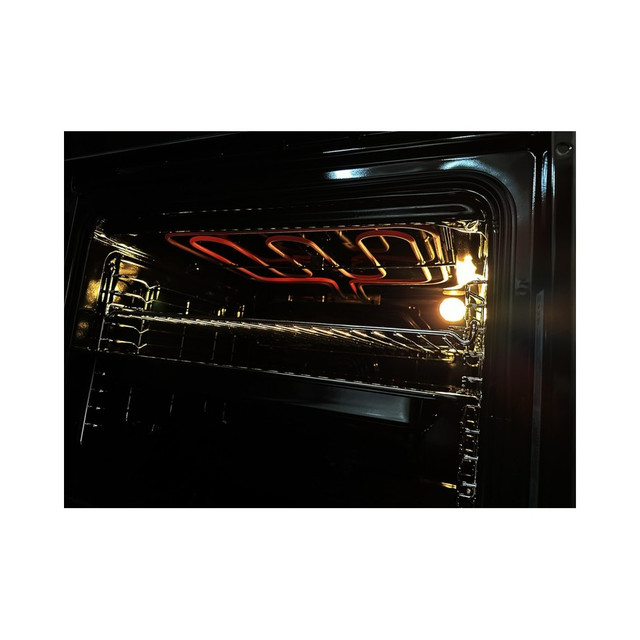 Фасад повністю скло. Двері — потрійне скло, знімне, розбірне для легкості прибирання. Ручка з матеріалу, який не нагрівається, не дряпається й не ковзає в руках. КЕРУВАННЯ — НАДІЙНА МЕХАНІКА. Емаль з очищенням парою. Хромовані напрямні для дек. Об'єм — 70 літрів. Вентилятор конвекції.