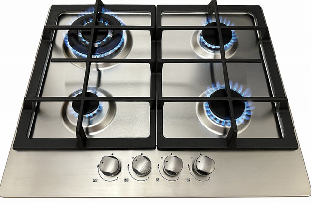 Варильна поверхня газова для вбудовування з нержавіючої сталі на чотири конфорки з чавунними решітками, газ контролем, автоматичним підпалюванням.