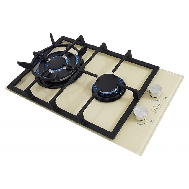 Вбудована варильна поверхня газова. Дві конфорки. Бежева — ніжний світлий кремовий колір. Суцільна чавунна решітка. Безпека — Газ Контроль. Автоматичне електрозапалювання. Turbo горілка — три кільця полум'я. Можливість під'єднання на балон.
