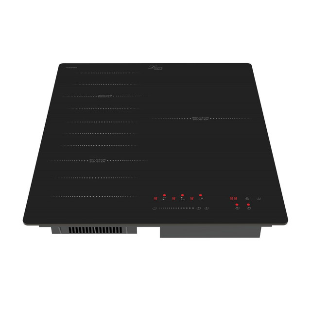 Індукційна варильна поверхня на три конфорки, 45 см завширшки. Зона поєднання конфорок для приготування на великому посуді. Великі квадратні конфорки, функціональне керування, рівний край скла. Функції Keep Warm, Stop and Go, Booster, таймер, блокування.